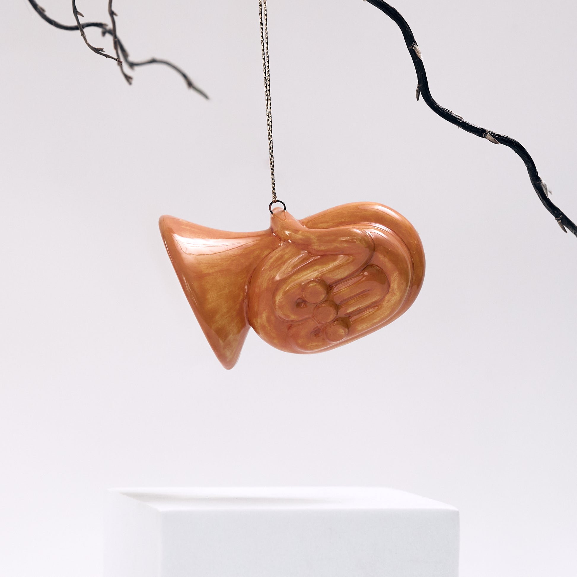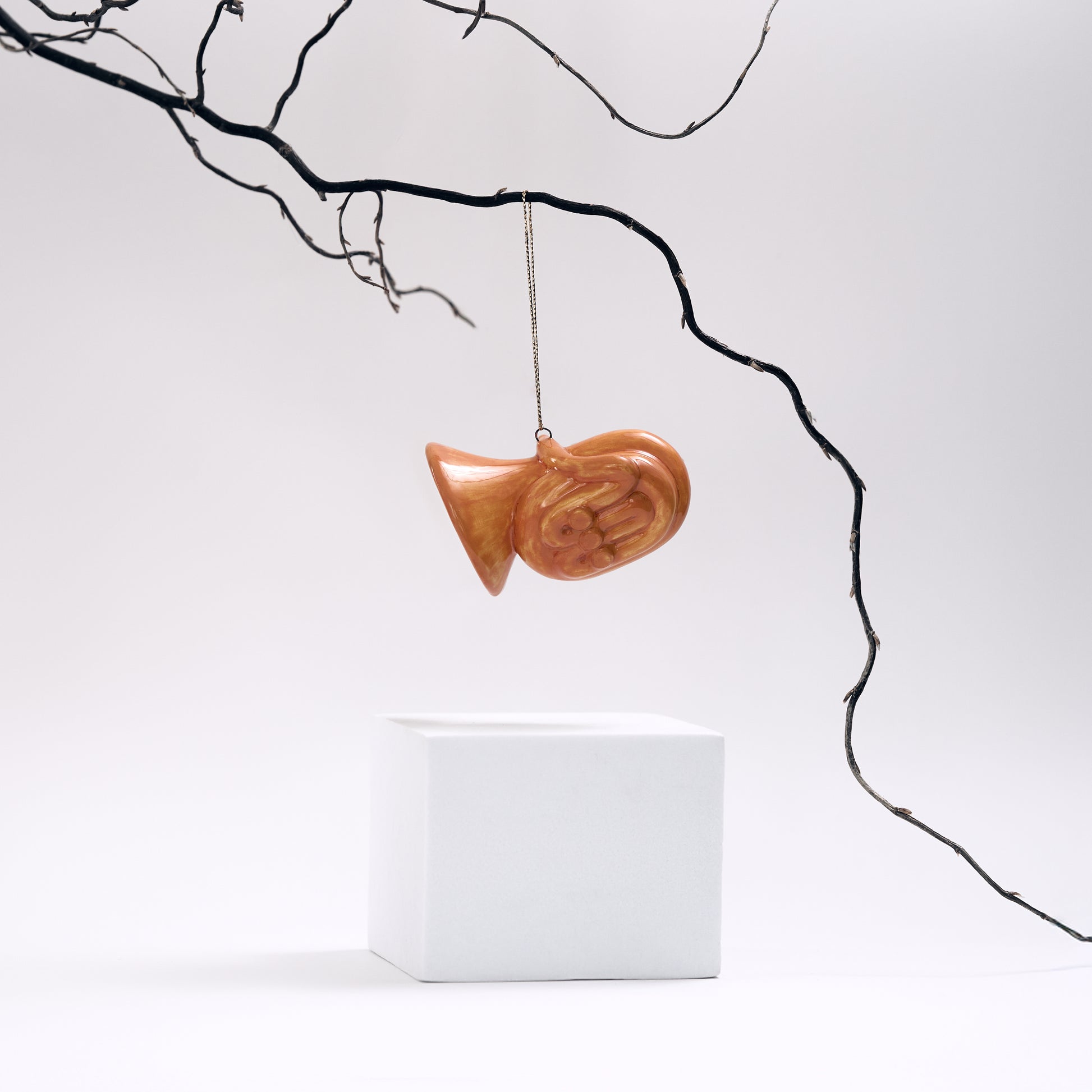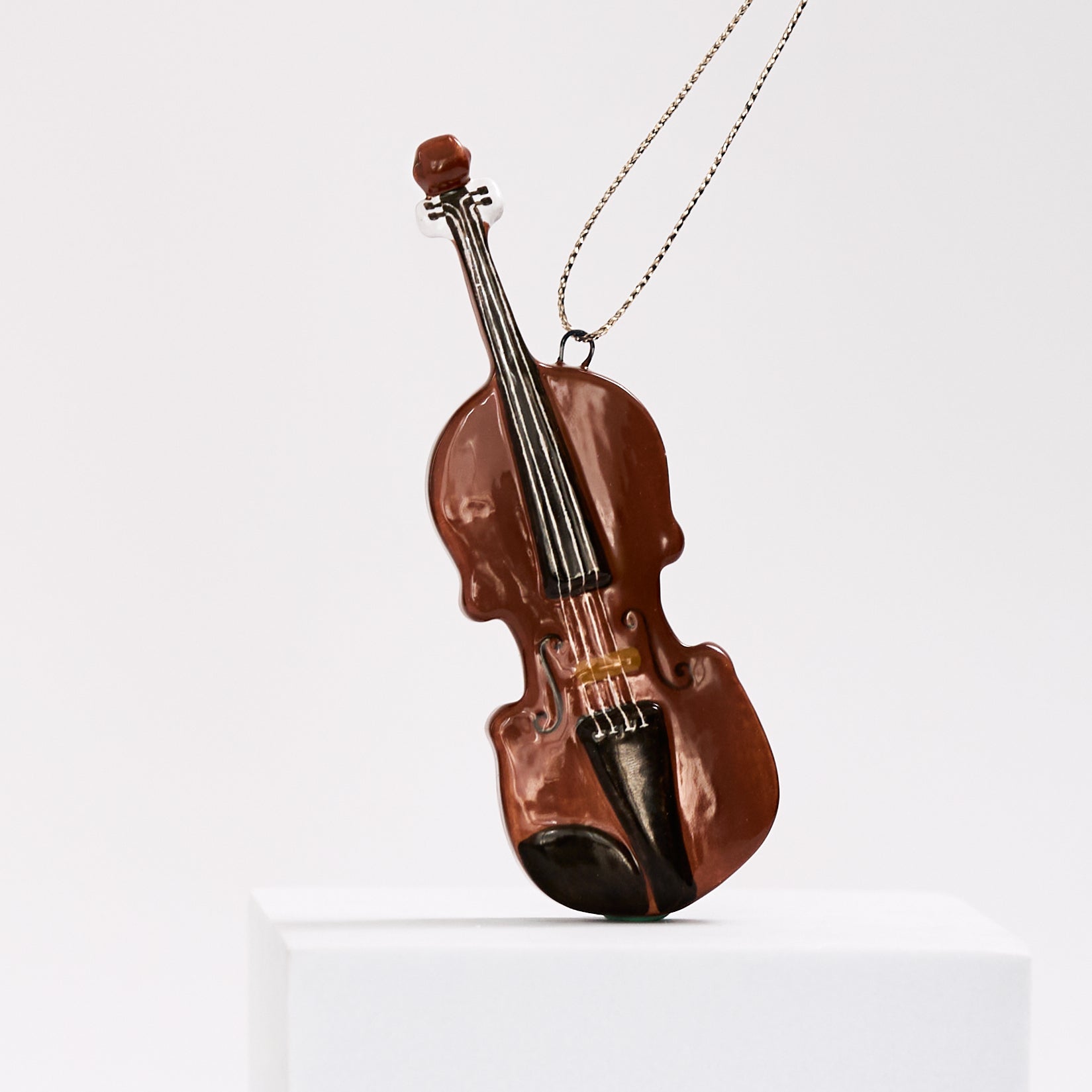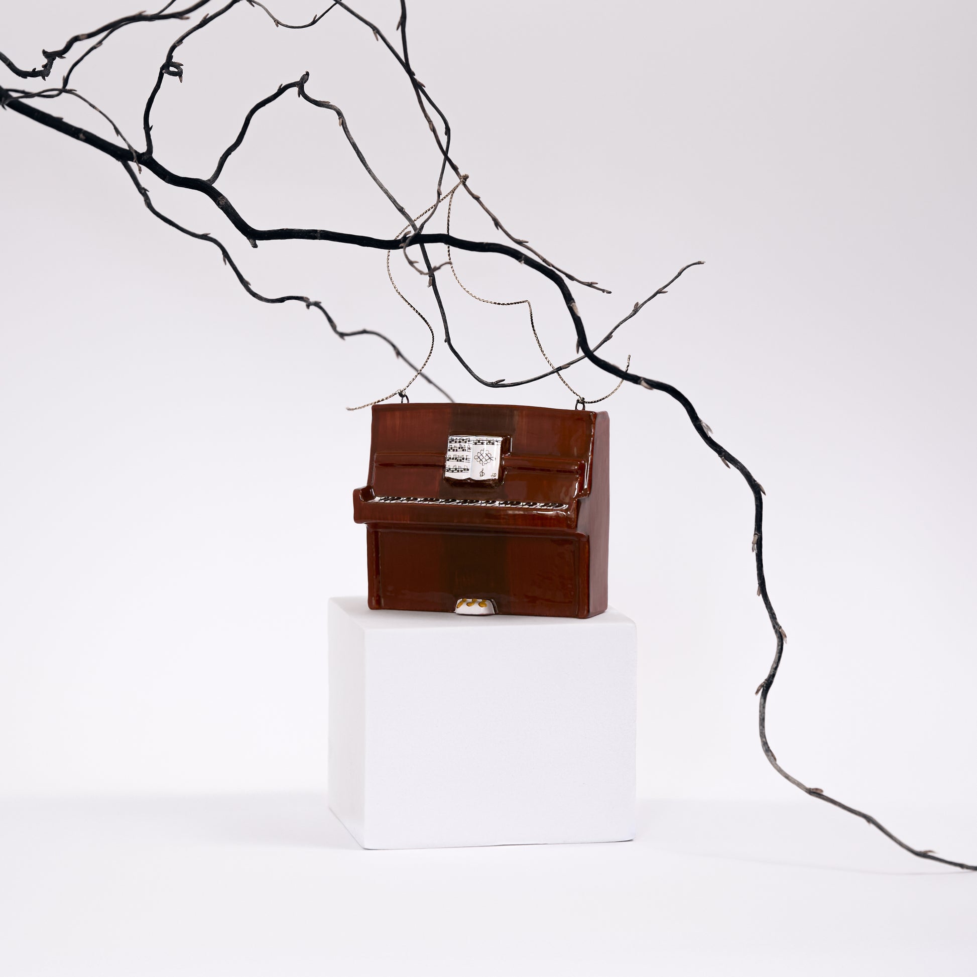 Handmade New Year's toys made of ceramics in the shape of piano, violin and trumpet by Yaroslavskaya ceramics manufacture.