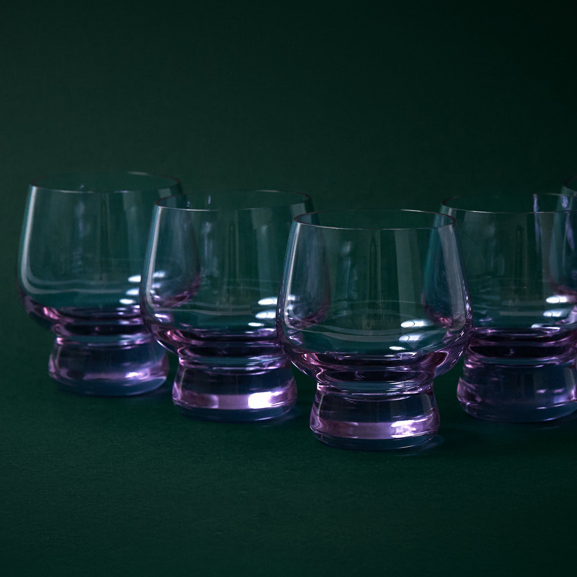 A rare complete set of 6 “Krepysh” shot glasses made from neodymium (also known as amethyst or alexandrite) glass — a material famous for its magical color-shifting properties.
